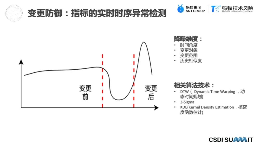 相关的算法技术,用到了动态时间规划、3-Sigma和KDE这样一些做实时时序异常检测的常见算法。在这个基础上,其实算法只是一个基础的技术能力,更重要的还是结合变更这个场景,在变更防御下能够利用更多的信息,对于这个时序异常检测的准确性做一个更精准的防控和降噪。这是在变更防御场景下比较特殊或者比较有特色的一个点。
