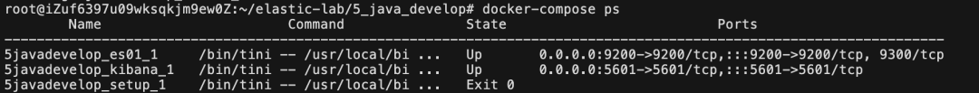 命令查看容器运行状态,其中 5java_develop_setup_1 容器是用于创建证书以及设置 elastic 和 kibana_system 用户密码的,执行完毕后会自动退出,我们需要确保其他容器处于 Up 状态。
