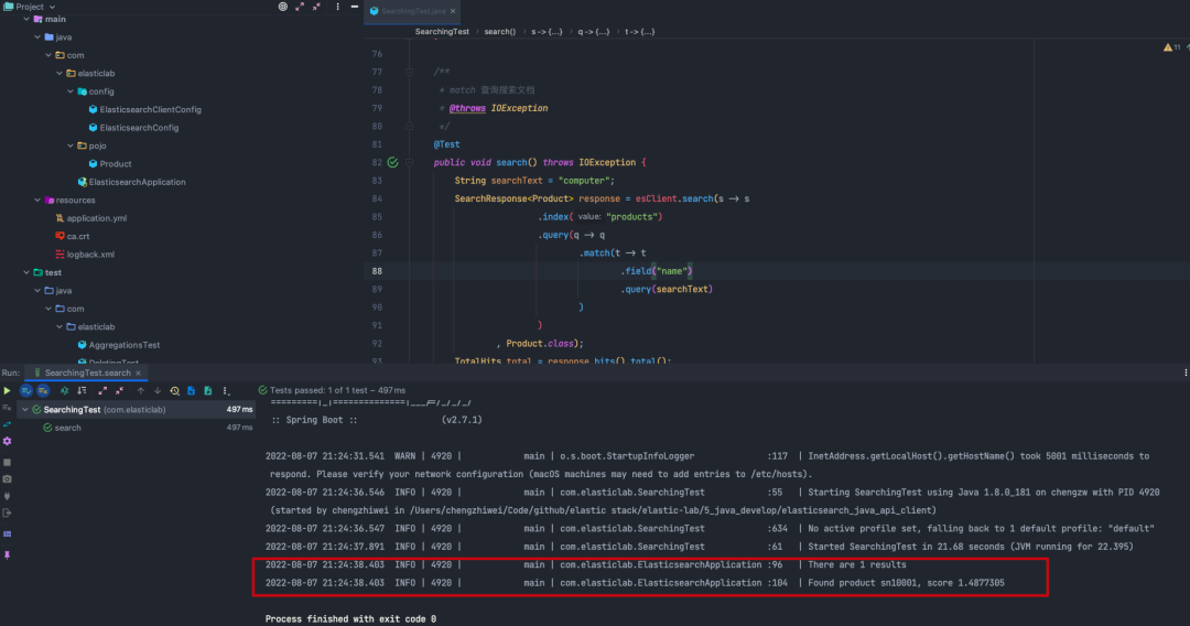 我们可以使用以下代码实现上述的全文查询,可以看出 search 是 Elasticsearch Java API Client 的一大优势,使用 Lambda 构建嵌套对象,大大简化了代码量,并且增强了代码的可读性。