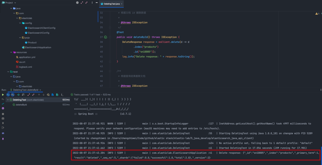 在 DeletingTest.java[7] 文件中可以找到完整代码,点击 deleteById()