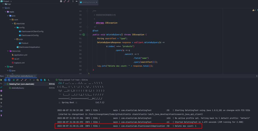 批量删除文档可以使用 deleteByQuery。如下所示,删除索引 products 中所有 name 字段的值是 ipad 的文档。