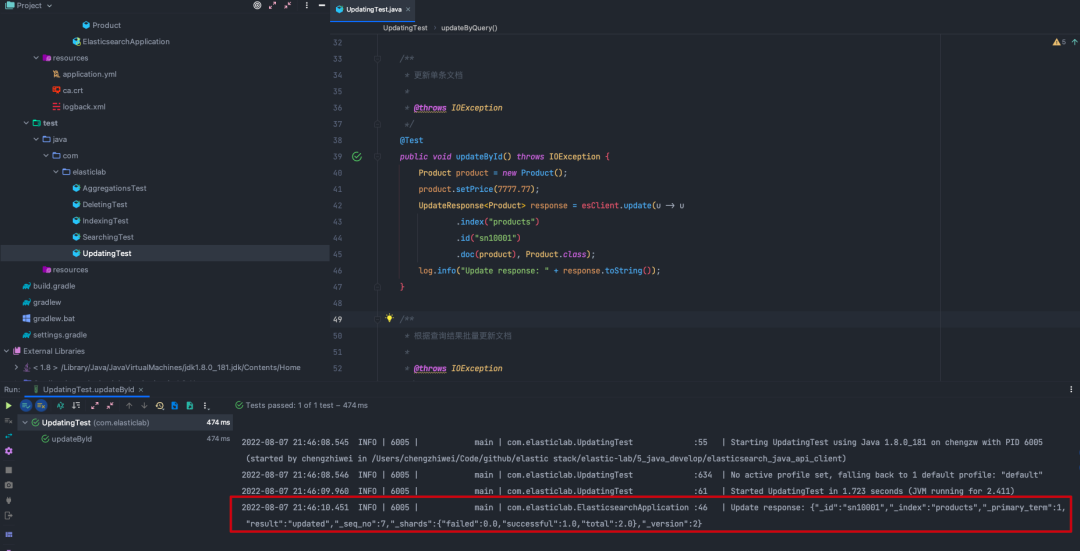 我们可以使用以下代码实现上述的单条更新操作,首先创建一个 Product 对象,然后设置对象的 price 字段值为 7777.77,然后使用 update 请求设置更新的索引名和 doc id,并传入 Product 对象。