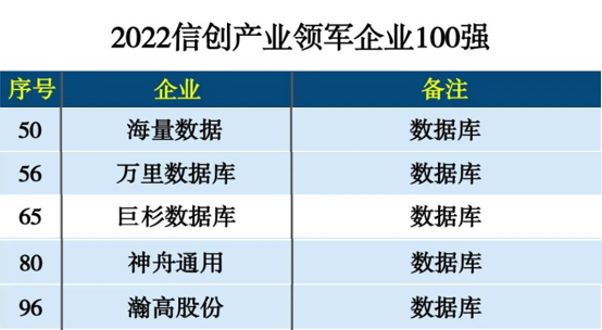 2022年12月22日,互联网周刊发布了“2022信创产业领军企业100强榜单”,其中海量数据、万里数据库、巨杉数据库、神州通用、瀚高股份等5家数据库厂商入选该榜单。下面跟随小编一起来看看榜单详情吧。 信创企业即信息技术应用创新产业相关企业,涵盖了半导体、芯片、数字技术、工业软件、信息安全等多个细分领域。
