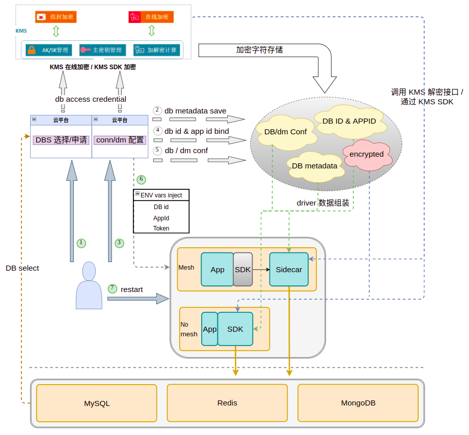目前爱奇艺使用统一配置中心存储数据库连接配置,使用 KMS 相关技术加密数据库访问配置,使用 ShardingSphere-JDBC 满足数据分片和负载均衡相关的需求,整体架构如下图。