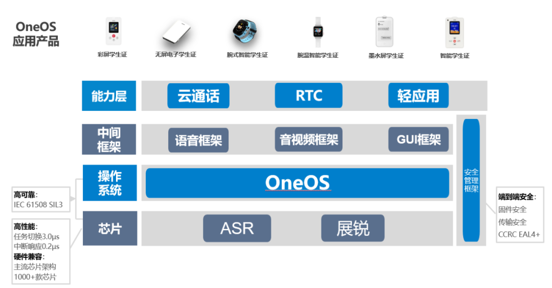 以OneOS电子学生证Turkey方案为例,基于OneOS物联网操作系统,包含GUI、音视频、音频框架三个基础框架,配套轻应用、RTC、云通话三大组件能力,支持主流的SOC芯片,如ASR、展锐等。框架接口统一简洁,支持硬件解耦,跨平台能力强,同时组件能力稳定、优质,为用户提供开箱即用的电子学生证解决方案。