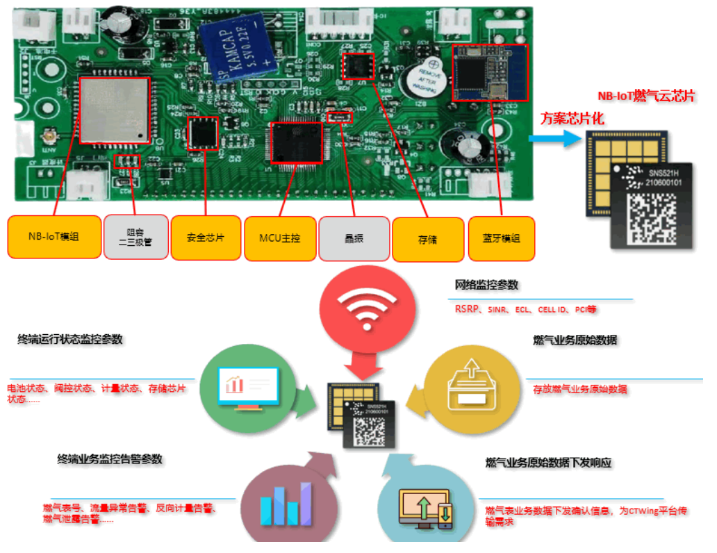 吾爱易达推出的全球首款 5G NB-IoT 燃气行业云芯片 SNS521H 芯片,在硬件上不仅集成 NB-IoT 通信功能的所有部件,还内置集成一颗独立的 Cortex-M0 核 MCU 和存储,将原本 NB-IoT 燃气表板上的 MCU+存储+NB-IoT 通信模组这种分立的模式,全部集成为一颗行业芯片,这种 MCU+NB-IoT 的集成模式,可大大降低表端开发设计的难度与工作量,使得燃气表设计 BOM 器件数量减少三分之一,表板 PCB 尺寸减小三分之一,燃气表 NB-IoT 射频性能提升,接收灵敏度提升 1.5dB,燃气表功耗降低,PCB 杂散电流减小,表端休眠液晶常显模式功耗可做到 12uA 左右,因器件减少和集成度提高,燃气表生产成本大幅降低,测试直通率提升,燃气表可靠性大大增强,而且在软件端支持 FOTA 远程升级能力,可同时支撑 NB-IoT 固件和表端应用固件升级,提升燃气表远程运维能力,同时 SNS521H 芯片内部还集成电信最新燃气行业物模型协议 AEP SDK,协议中集成网络覆盖参数、终端运行状态监控参数、终端业务监控参数、燃气终端业务数据(透传)等参数,拉通电信 CTWing 平台和天翼云平台能力,基于燃气云芯片 SNS521H 的燃气表端,将定时或不定时上报网络和表端参数,结合电信 AEP 平台和 DEP 平台大数据 AI 分析能力进行整合分析,并将各数据分析结果推送终端用户,终端用户结合推送结果,可快速判断表端异常状态情况并分析,快速定点运维,可实现终端监控、管道监控、应用监控三个功能,大幅度提升燃气运维服务能力。