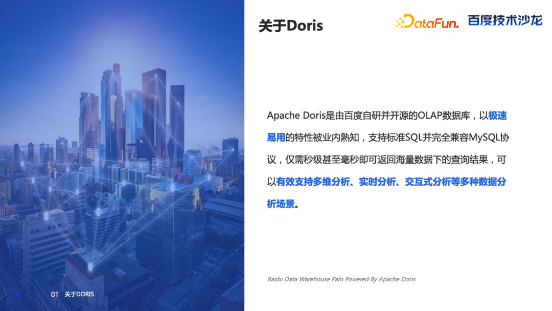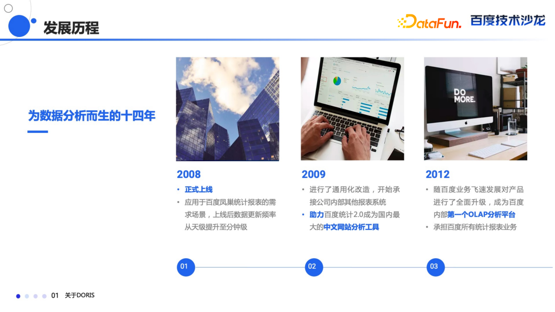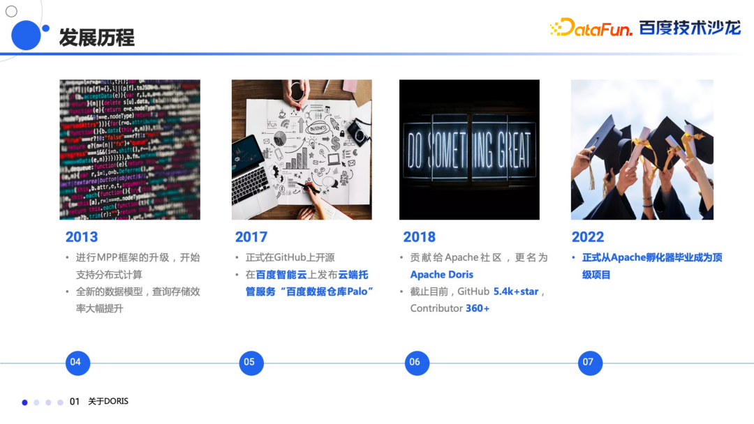 今天的分享主要分以下几个部分,首先介绍一下 Doris 的发展历程,之后会介绍 Doris适用场景,之后会比较详细的介绍 Doris 核心的产品特性,最后会介绍一下 Doris未来的发展的趋势和在规划中的一些新的 Feature。