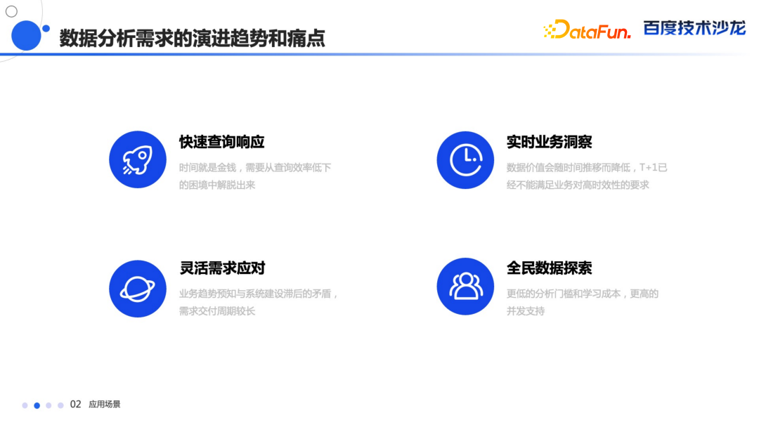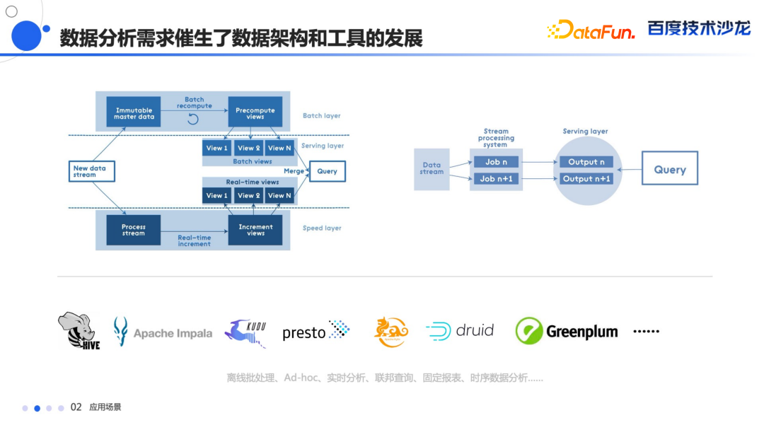 查询效率低下,需要一个快速查询响应的工具。 分析时效性提高,随着业务的发展,T+1 的分析已经不能够满足业务要求。 需要更灵活的方式去应对业务趋势和系统建设滞后的矛盾,以及交付周期长的问题。 随着业务分析人员的增多,需要更低门槛的分析工具,来满足全民数据探索的需求。