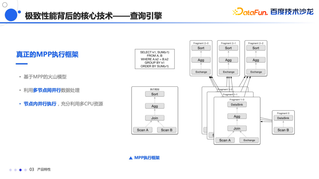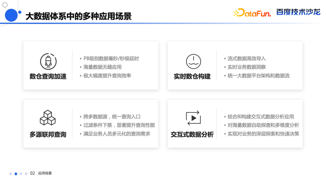 海量数据上面提供亚秒级查询延迟响应。 支持流式数据的导入,完成实时的业务洞察。 统一大数据平台平台架构和数据流。 还能通过跨多数据源的联邦查询,支持像 ODBC,Hive,Iceberg,Hudi,ES等多种数据源。 能通过多种 Connector 和 Flink、Spark 这些数据分析工具有非常良好的交互,满足业务人员多元化查询需求。 通过 MySQL 协议能够方便地和其他的 BI 工具进行无缝的对接,提供对海量数据的自助探查和多维度分析的能力。