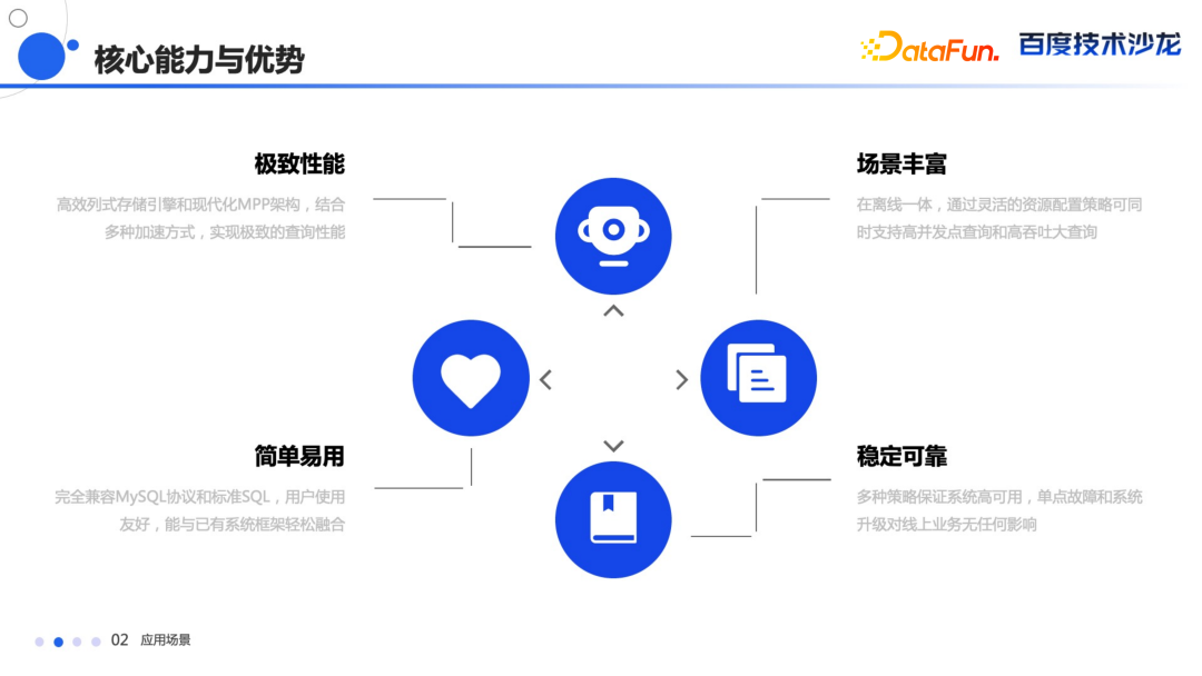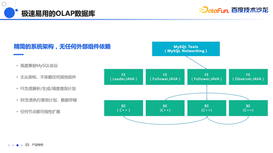 通过内部的各种优化手段,提供极致的性能。 通过灵活的种资源配置能够同时支持高并发和高吞吐的大查询,支持非常丰富的查询场景。 兼容 MySQL 协议,支持标准 SQL,非常简单易用,能够与现有系统非常好的融合。 内部提供多种高可用的策略的保证,像单点故障和系统升级等对线上业务基本无感。