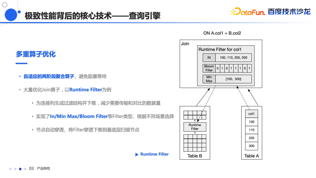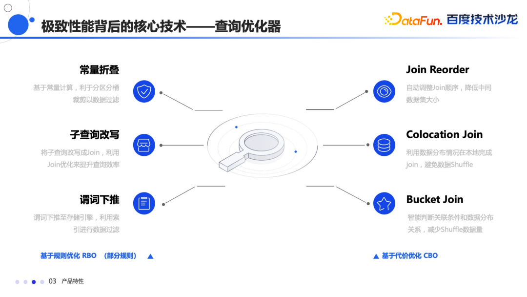 Join Reorder:自动根据数据的分布和大小自动调整 Join 顺序。 Colocation Join:在数据存储的时候,会根据规则,将数据按照一定顺序规则分布到相同的节点上,在 Join 的时候能够完成本地 Join,避免数据 Shuffle,从而大幅提升查询性能。 Bucket Join:这是 Colocation Join 的升级版本,它会自动判断关联条件中的数据分布关系,如果符合要求,会自动进行 Colocation Join,从而减少数据的 Shuffle。