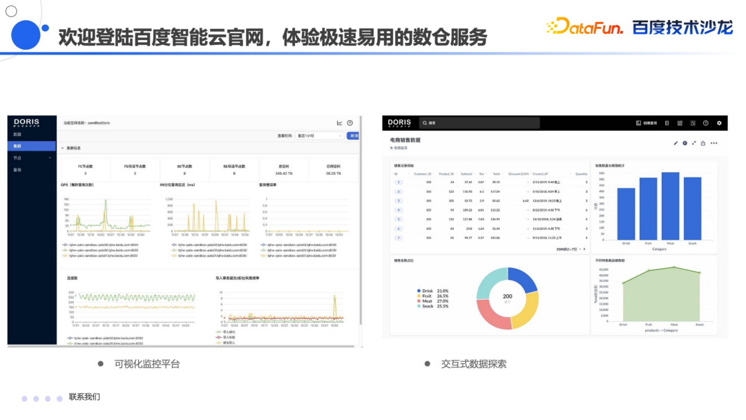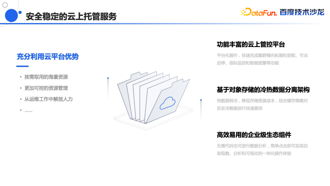 能够充分利用云平台的优势,能够按需去取用海量的资源,可以更加可控的进行资源管理。 即将上线基于对象存储的冷热分离的架构,降低数据成本,也能够结合缓存策略对冷数据进行快速查询。 提供更丰富的云上的管控和监测工具,能够快速的扩容缩容,变配啊,程序启停,监控报警功能,同时提供一些企业级的生态组件,帮助用户去自助的取数分析。