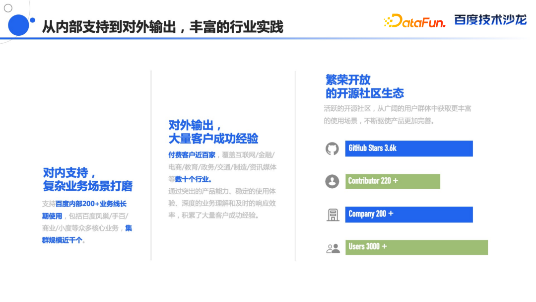 2008 年正式上线,服务于百度的凤巢,上线之后数据的更新频率从原来的天级变成了分钟级; 2009 年内部进行了通用化的改造,开始承接公司内部其他的报表需求; 2012 年承接了百度内部几乎所有的报表业务; 2013 年进行全面 MPP 框架升级,开始支持分布式计算,对于底层的数据模型做了大规模的改进,查询和存储效率都有极大的提升; 2017 年决定把 Doris 在 GitHub 上进行开源; 2018 年贡献给 Apache 社区,并正式更名为 Apache Doris,截至目前在 GitHub 有 5.4k 多的 Star,Contributor 数量超过了 360; 2022年 6 月份正式从 Apache 孵化器毕业,成为 Apache 的顶级项目。