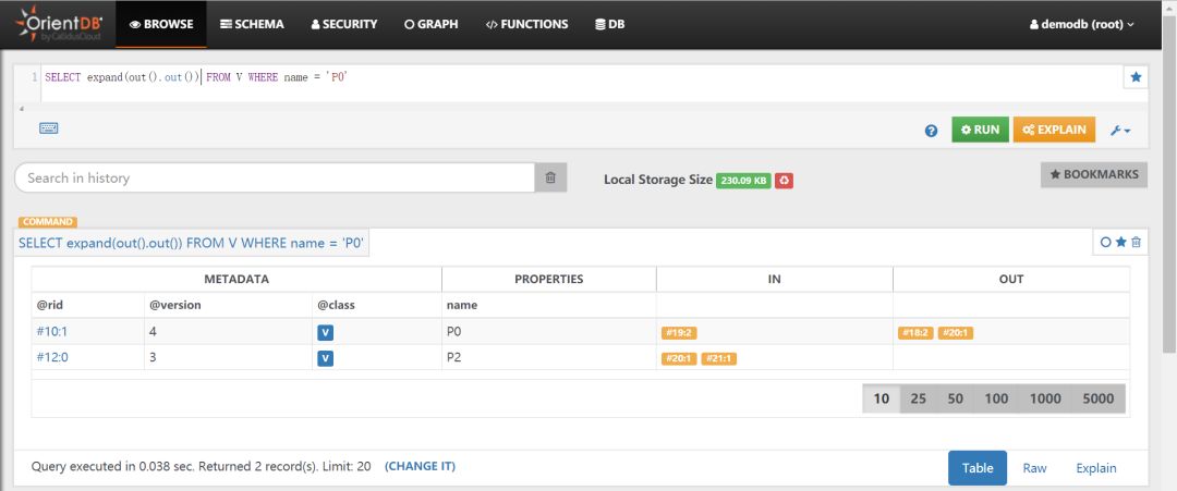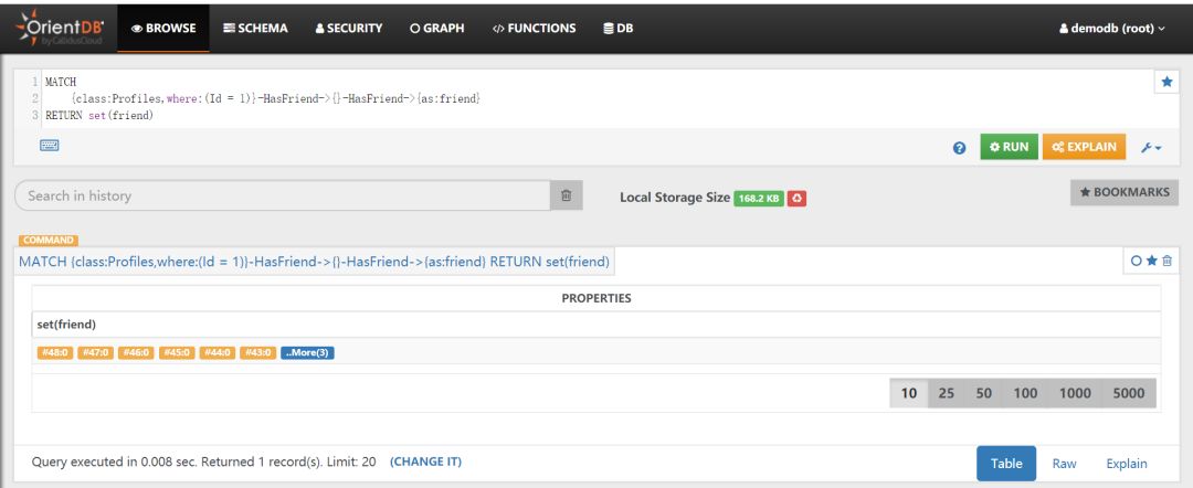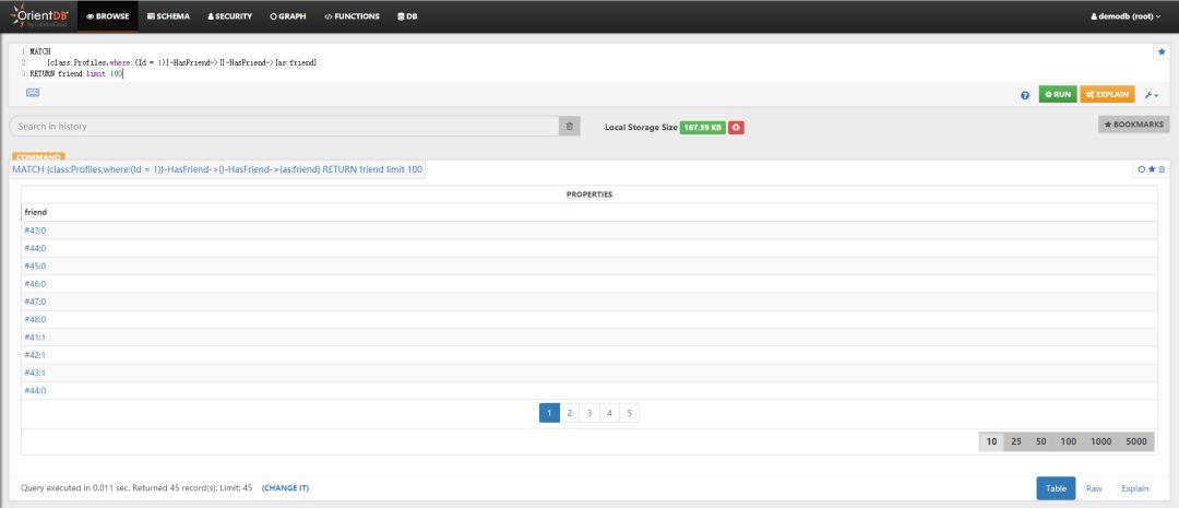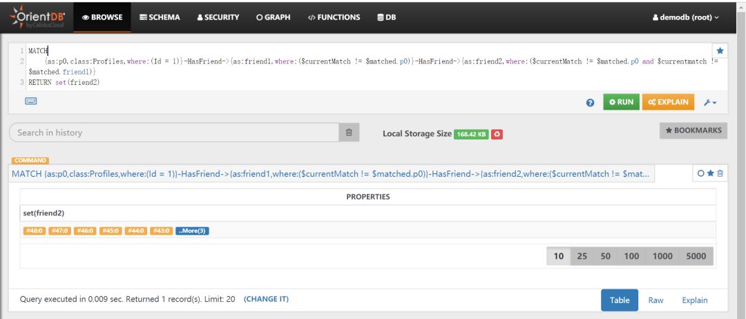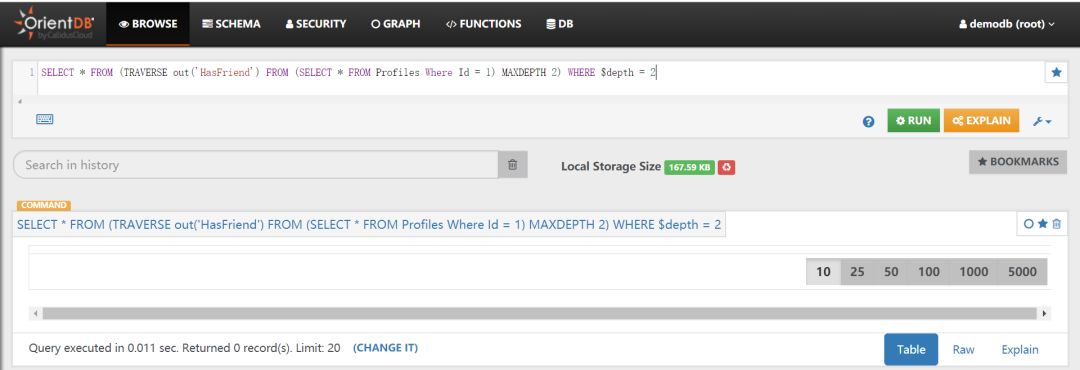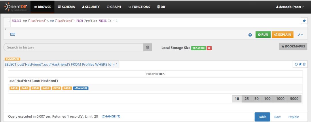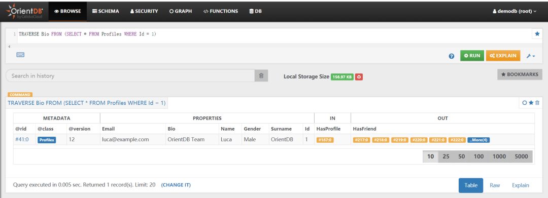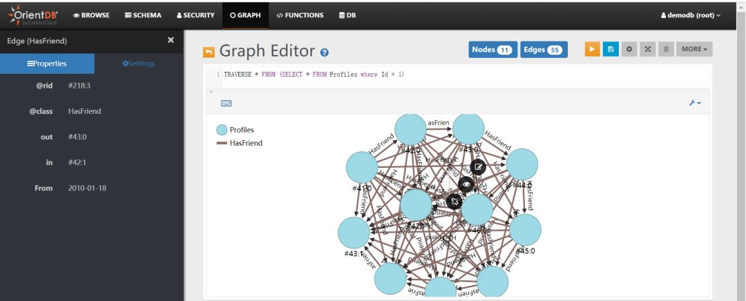 分析:上图中Bio是Profiles的普通字段,而Hello不是Profiles的字段,out_HasFriend是系统自动为Profiles创建的边的record。TRAVERSE是基于relationship来遍历的,普通字段不会触发遍历,而对于边的遍历也仅仅遍历到边这一层而已。上图中展示一条记录也是Id为1的根记录,在TRAVERSE的查询结果中查询目标对象总会被查询出来,而且深度为0。