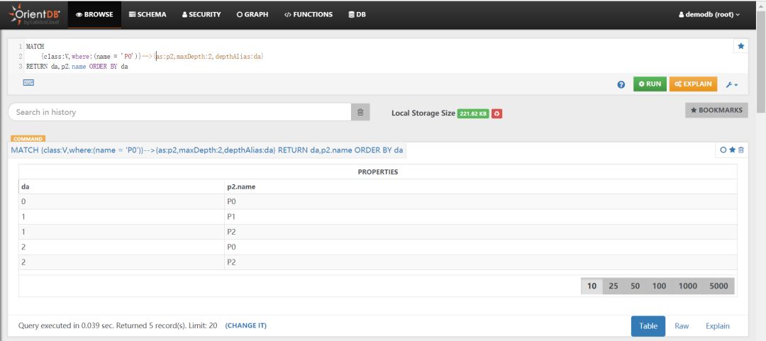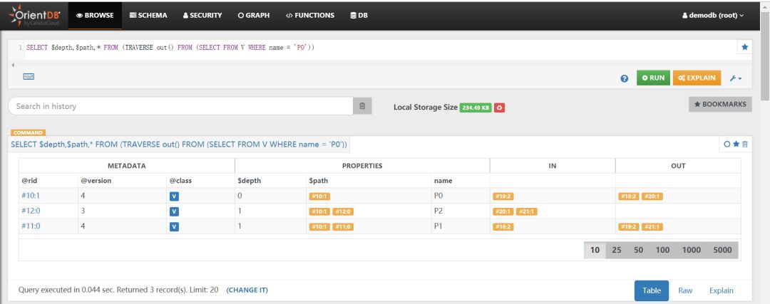 SELECT $depth,$path,* FROM (TRAVERSE OUT() FROM (SELECT FROM V WHERE name = 'P0'))