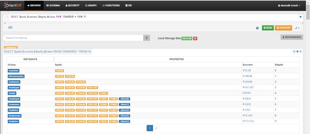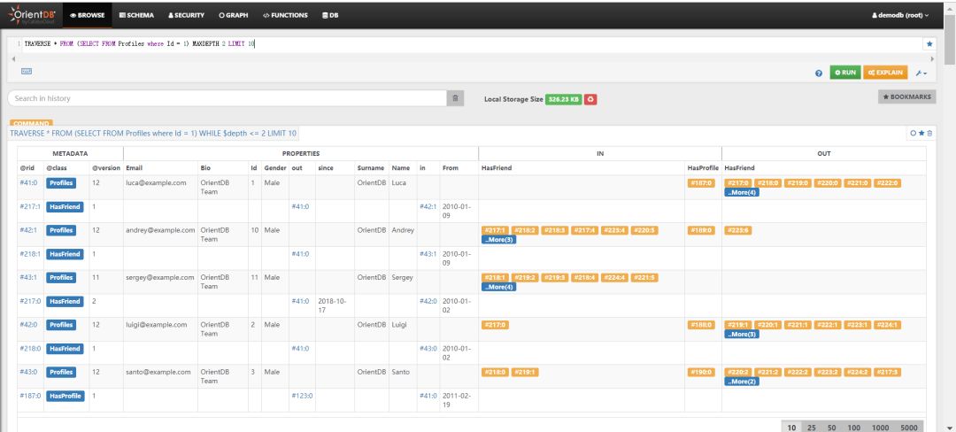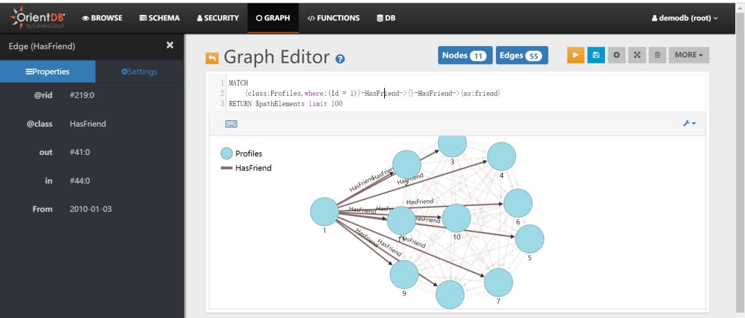 本文介绍的TRAVERSE语法是基于OrientDB3.0.x版本,所有的SQL在OrientDB3.0.4社区版本自带的数据库demodb下试验,数据模型请参考demodb。