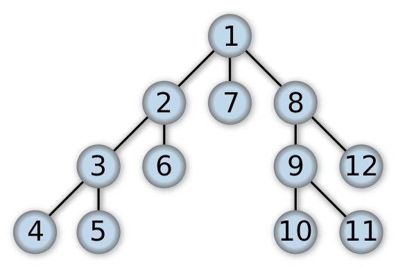 DEPTH_FIRST,基于深度优先搜索算法。沿着树的深度遍历树的节点,尽可能深的搜索树的分支。当节点v的所有边都己被探寻过,搜索将回溯到发现节点v的那条边的起始节点。这一过程一直进行到已发现从源节点可达的所有节点为止。如果还存在未被发现的节点,则选择其中一个作为源节点并重复以上过程,整个进程反复进行直到所有节点都被访问为止。如下图基于深度搜索算法的遍历顺序。