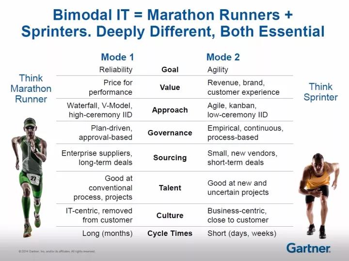 双模BI是指企业在部署传统BI系统的基础上,配套更加灵活的敏捷型BI。Gartner把两者在企业中的关系形象地类比成马拉松运动员和短跑健将的关系。