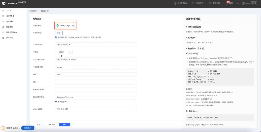 ② 创建数据目标 Doris 的连接