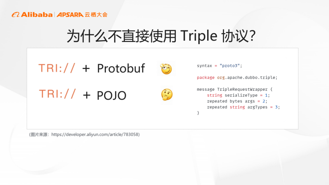 由于gRPC的PB序列化格式,Triple协议无法直接使用。尽管Triple协议对PB兼容性较好,但PB要求先写契约再生成代码,而Dubbo要求先写代码,不存在契约,数据模型也是与PB对象完全不同的POJO格式。