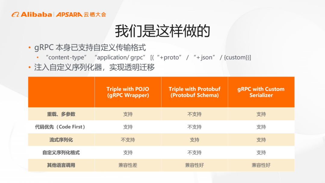 为解决Triple协议带来的问题,项目给gRPC添加了自定义序列化器。这样不仅可以实现流式的序列化,也可以为用户提供和原生Dubbo一样的使用体验。