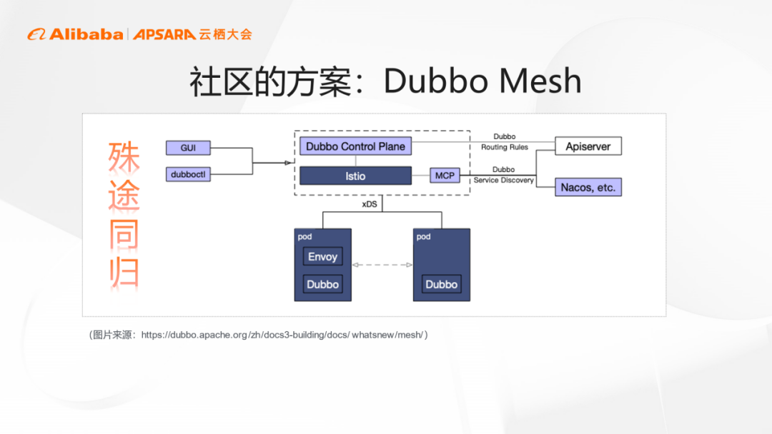 目前,社区内Dubbo Mesh的研发工作也在积极进行,其做法跟携程云原生微服务治理框架类似。通过单独的控制面将配置数据写到K8s里,将实例数据通过MCP进行同步。
