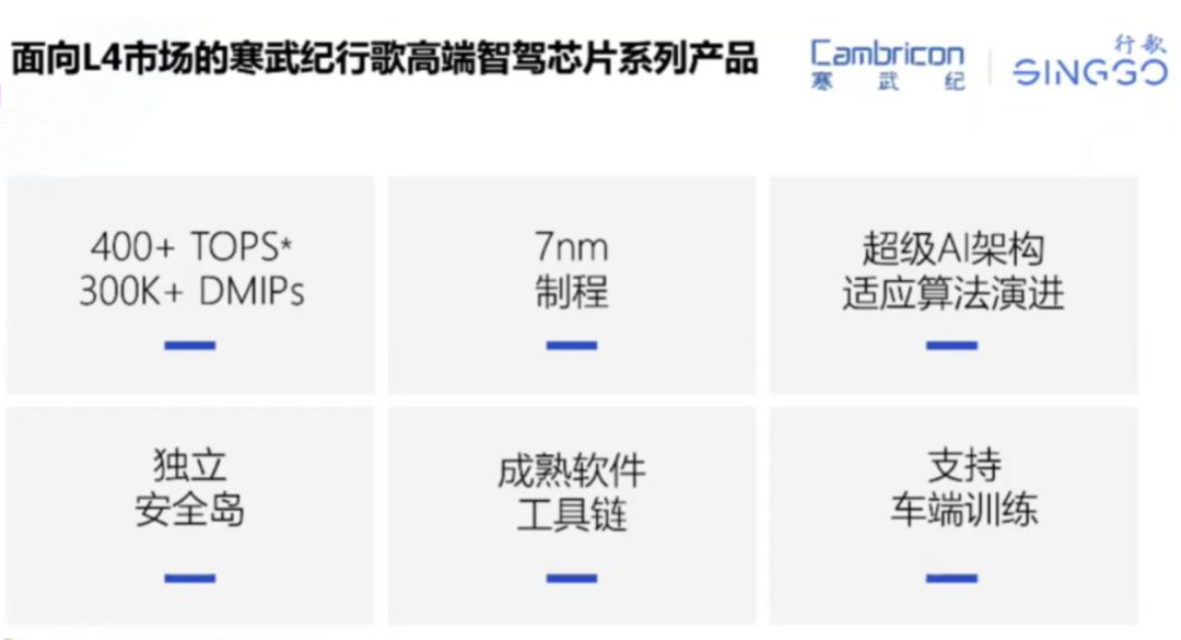 2021年7月8日,世界人工智能大会期间,寒武纪创始人陈天石正式公布了关于行歌智能驾驶芯片的基本信息,包括算力超过200TOPS、7nm制程工艺,以及独立安全岛、成熟软件工具链等。