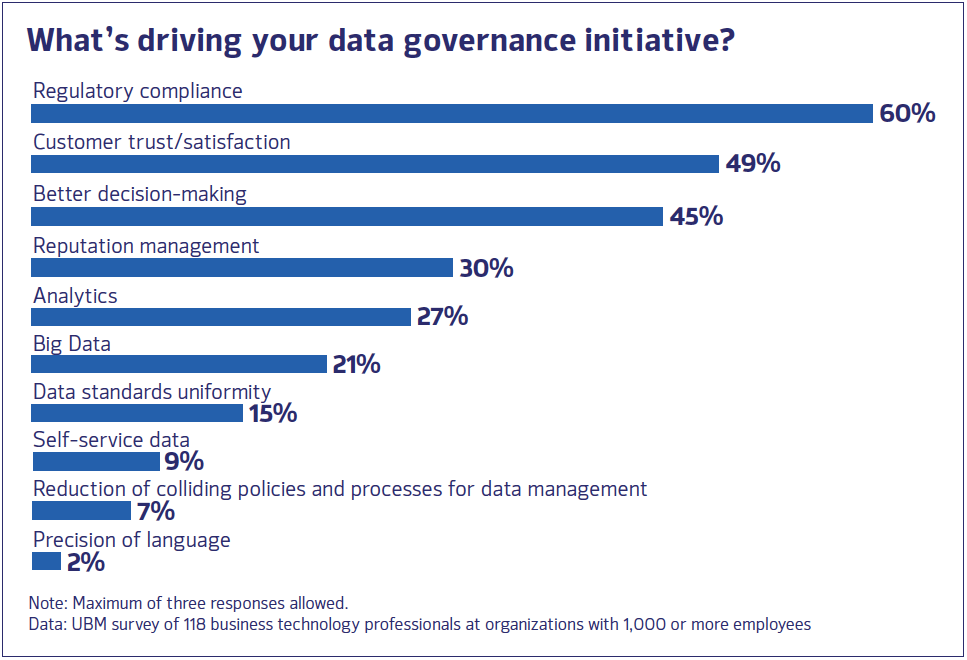 保护数据和降低风险的需要是许多公司推动数据治理的一个重要因素。事实上,我们的调查发现,60%的受访者认为,合规性是推动数据治理的最普遍因素。