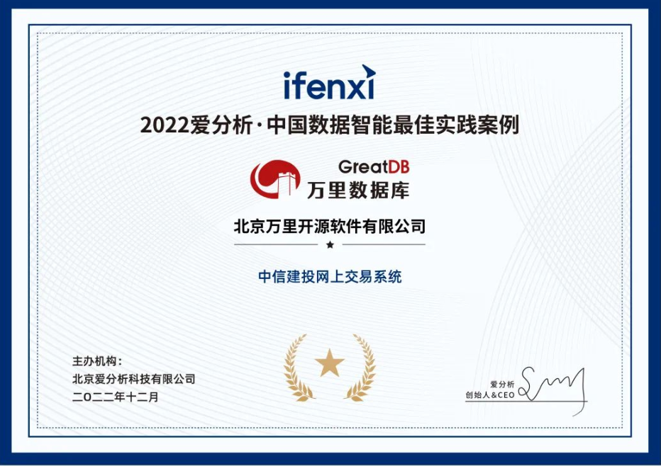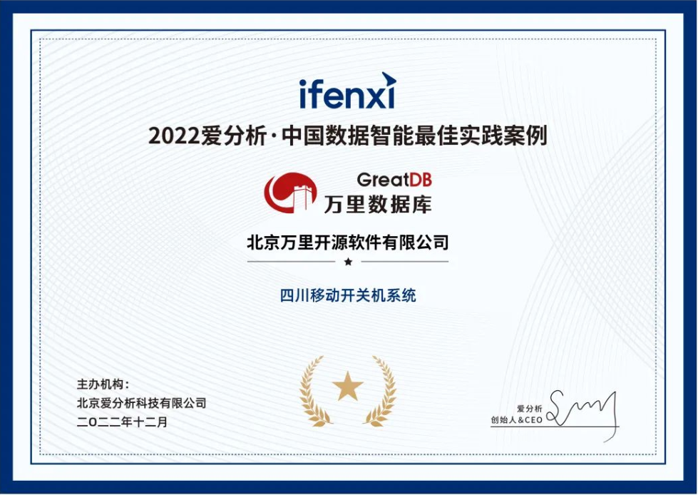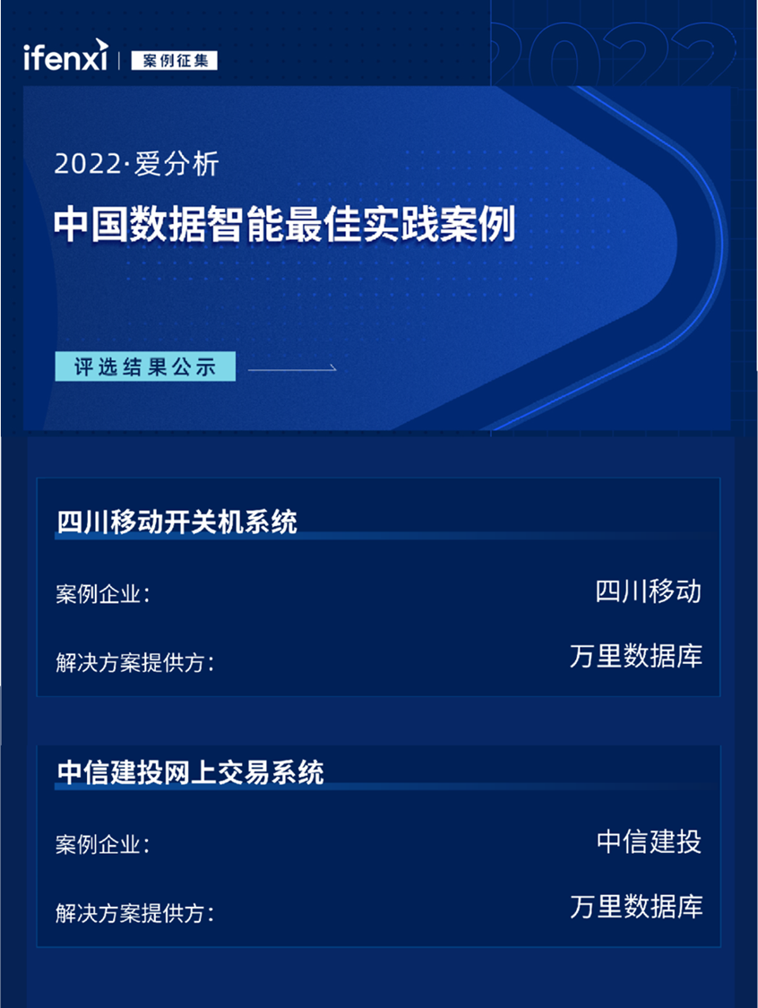 随着2022年临近收官,万里数据库喜报频传。近日,“2022爱分析·中国数据智能最佳实践案例”评选征集活动落下帷幕,经过申报、初评、调研、终评等多轮激烈角逐,万里数据库携手四川移动和中信建投打造的四川移动开关机系统、中信建投网上交易系统从诸多申报案例中脱颖而出,两项案例均成功获评“2022中国数据智能最佳实践案例”。