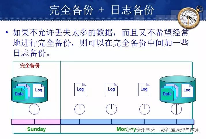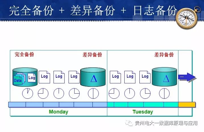 如果进行一次完整备份比较耗时,用户希望间隔长点再进行完整备份,如果采用完整+日志,恢复会比较耗时,因为利用日志恢复时,系统是将日志记录的操作重做一遍。这时可以采用完整备份+差异备份+日志备份。这种策略的优点是备份和恢复都比较快。丢失的数据也较少。