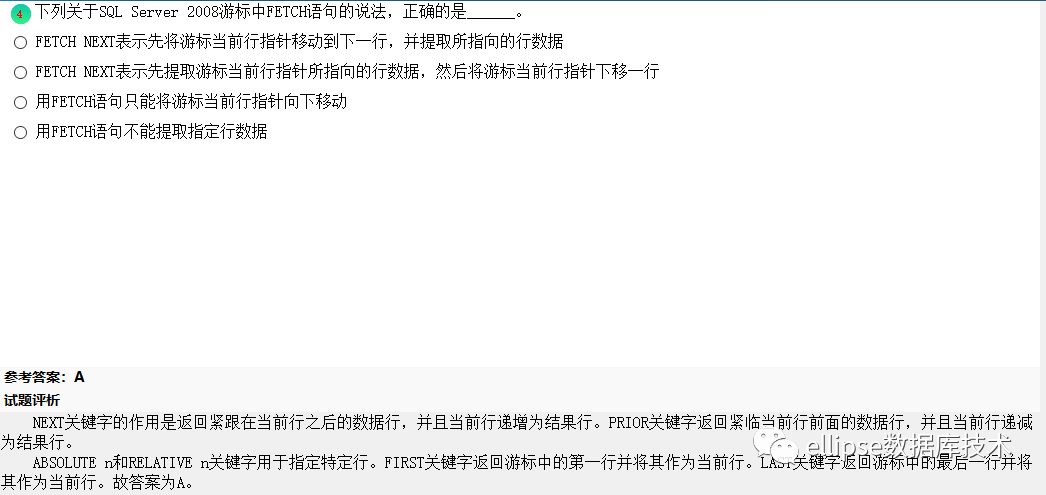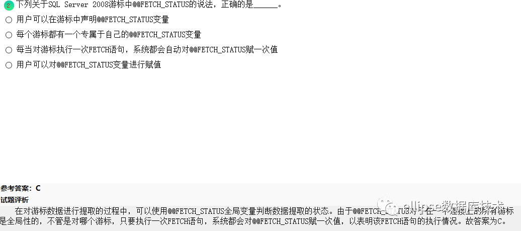 可以使用@@FETCH_STATUS全局变量判断数提取的状态。由于@@FETCH_STATUS对于在一个连接上的所有游标是全局性的,不管是对哪个游标,只要执行一次FETCH语句,系统都会对@@FETCH_STATUS赋一次值,以表明该FETCH语句的执行情况。