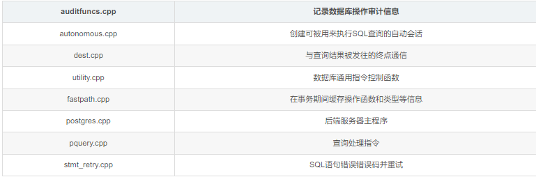 traffic cop(tcop)源码目录为:/src/common/backend/tcop。traffic cop(tcop)源码文件如表4所示。