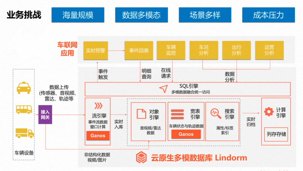 第一类是车载信息服务提供商(TSP),TSP目前在车联网产业链中处于一个非常核心的地位,这一方参与者除了奔驰宝马一类的整车厂商和第三方技术提供商,全球知名高科技企业如苹果、微软等也在积极进入这个领域。这类厂商往往有大量的数据需要从车辆回传到后端平台去做存档或者车辆的诊断。在新能源汽车国标( GB/T 32960)里,强制要求新能源汽车存储近期车辆数据以便进行事故的回溯,精度甚至要求1s回传一帧数据。有一些大型车厂商,车辆保有量可能超过100万辆,每秒上报一次数据的话,数据库入库的TPS就有100万/秒。这种大吞吐的写入,大部分传统数据库是无法支撑住的。另外,一些TSP还会提供一些与车辆轨迹相关的增值服务,比如电子围栏,当车辆行驶出用户设定的围栏时自动报警,这些需求,都需要一个能够高效处理轨迹时空查询的数据库。第二类是自动驾驶厂商,自动驾驶是目前最炙手可热的领域,新兴的自动驾驶公司也如雨后春笋般冒出。这类厂商不仅要面对海量数据收集的问题,还面临着大量非结构化数据处理的挑战。他们往往要从测试车上采集大量的音频,视频和雷达数据来做AI训练,可能一个包传上来就几十MB,甚至几百MB,那么传统的数据库中,大KV的处理是非常低效的。同时,在AI领域,数据处理的链路会非常长。首先他们要把原始数据入库,然后要把数据读取出来进行模型训练,然后训练后的标注数据又要写入数据库,所以这里有高速点查的需求,又有高吞吐并发读写的需求,还有分布式分析,跑AI模型的需求,使用传统数据库和大数据架构的话,会引入非常多的组件,运维成本非常大的。第三类参与方是平台管理方,如政府的车辆监管平台,城市道路监控和路网信息维护,这类用户会管理一个地域所有的车辆或者路网信息,面对海量信息上报,而往往这些数据只会归档存储,数据价值密度非常低。因此,存储成本以及快速进行BI分析产生报表来指导政府决策成为主要压力。通过车联网三类参与方的介绍,我们看到海量数据处理使车联网企业面临了前所未有的挑战,非结构化数据如音视频,半结构化数据如打包在JSON里上千种车机数据以及结构化关系型数据的混合处理让传统数据库力不从心。结构化、半结构化、非结构化等多种数据往往需要用户引入大量数据库组件从而带来复杂的数据链路管理。面对种种挑战,很多汽车行业用户都选择了阿里云Lindorm云原生多模数据库。Lindorm是阿里云自研的一款适用于任何规模、多种模型的云原生数据库服务,支持海量数据的低成本存储处理和弹性按需付费,提供宽表、时序、搜索、文件等多种数据模型,是阿里巴巴核心业务提供关键支撑的数据库之一。