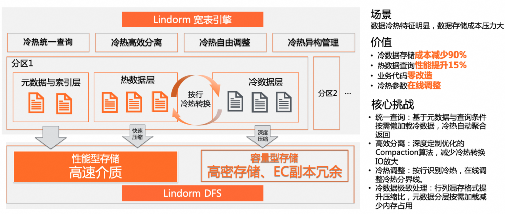 除了Lindorm的超高压缩比之外,Lindorm还支持透明的冷热分离技术,像车联网中存储的轨迹数据,如果超过一段时间后查询量变少,或者是其他归档数据,Lindorm可以支持自动将数据归档到冷存储中去,因此能大幅缩减成本。
