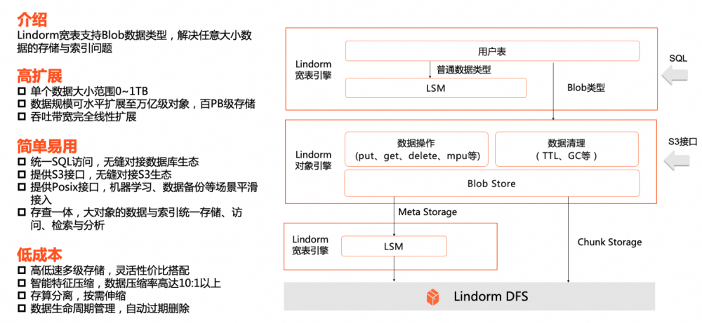 而Lindorm内置了达摩院空天数据库引擎Ganos,可以一站式的解决海量轨迹场景的存储和各类查询需求,弥补了各类NoSQL在时空方面的不足。在Lindorm中,可以使用SQL语法非常便捷地处理各类时空查询场景,在查询性能上,要大幅领先业界已有系统2~3倍。详细的评测大家可以参考这篇文章《轨迹数据处理“小钢炮”,Lindorm时空引擎Ganos实测》车联网场景中,经常会遇到大对象数据的处理,如传感器打包数据,rosbag数据,音视频文件等等,这些数据从几十KB到数GB不等。传统数据库很难处理这些大对象。因此很多公司都是把大对象的元数据存储在数据库中,把对象本身上传到OSS/S3等对象存储上,这种分散的管理方式给用户带来了过高的运维和开发成本。而在Lindorm数据库中,内置了Blob类型。Blob类型的数据会直接存储在Lindorm底层的文件系统中,并由ChuckStore来进行管理,这种Key-Value分离的存储方式,避免了传统数据库存储大KV数据库时产生的读写放大问题,并且Lindorm底层的ChunkStore支持流式传输大KV数据,也避免了OOM。所以在Lindorm中,使用SQL就可以轻松存储数GB的大对象数据。车联网中的数据一般都会有“有效期”这一概念,如收集的车辆传感器数据,轨迹数据等,等到一定的时间之后,这些数据就不再需要存储,需要从数据库中删除这些过期的数据。在传统数据库中,往往需要用户来手动删除这些数据。比如写一个定时的脚本,定期从数据库中删除过期数据。这样增加了运维的复杂度,而删数据这个操作,本身也会对数据库造成过大的压力。而Lindorm支持数据的全生命周期管理。Lindorm里支持不同等级的TTL(Time-To-Live)设置,自动管理数据的过期。比如在表上设置数据过期时间为7天,那么7天前写入的数据将自动被删除,无需用户管理,大大降低了运维成本。