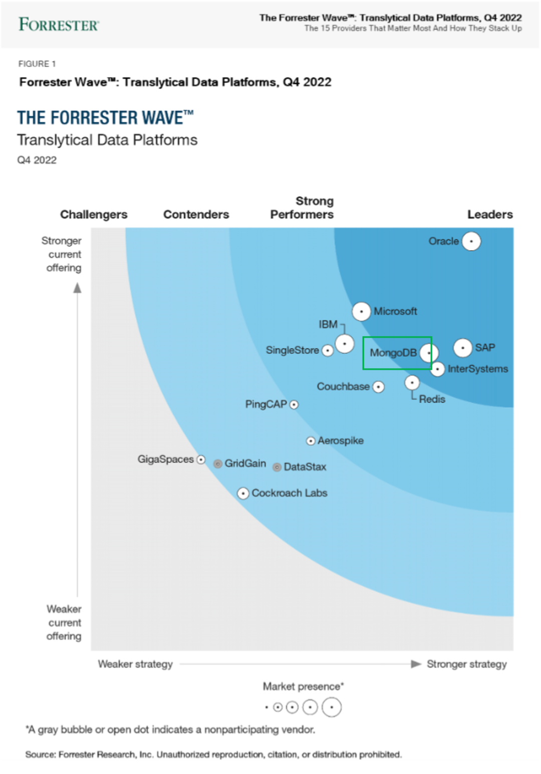 在 2022 年第 4 季度的 Forrester Wave™ “事务分析型数据平台”报告中,Forrester 将事务分析型数据平台描述为“支持事务性、操作性和分析性工作负载,而不会牺牲数据完整性、性能和分析规模”。MongoDB 被评为该领域的领导者。