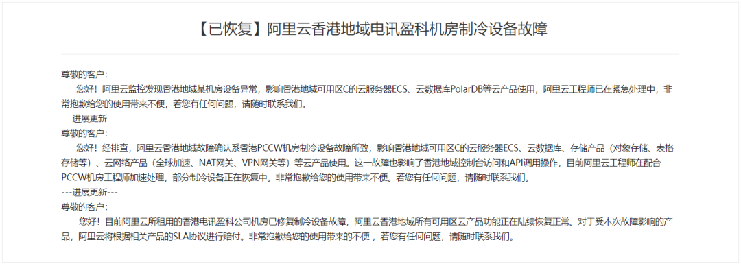 据媒体报道,12月18日,阿里云香港PCCW机房制冷设备发生故障,直接影响了香港地域可用区C的云服务器ECS、云数据库、存储产品(对象存储、表格存储等)、云网络产品(全球加速、NAT网关、VPN网关等)等云产品的使用。云产品的大面积停摆,使得托管在该地域的众多服务项目无法访问,网络上已有多位用户反馈,此次事故造成宕机和服务不可用时间超过了24小时,损失巨大。