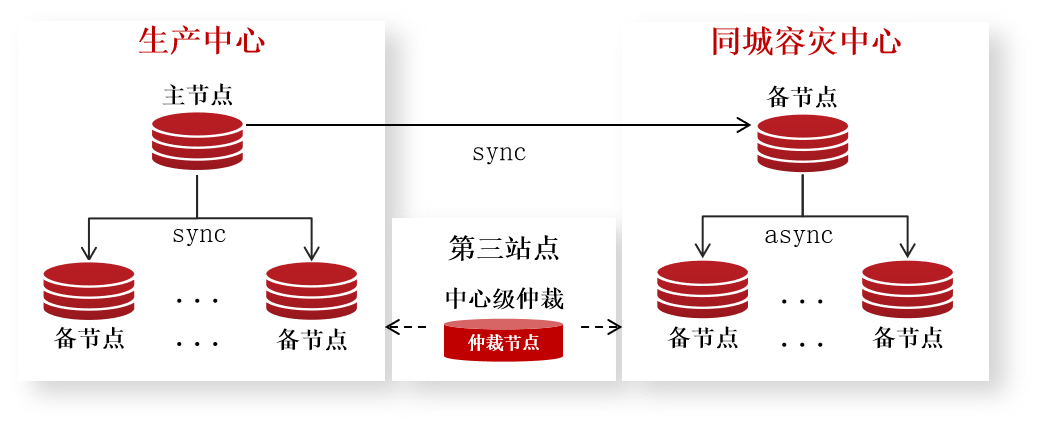 第三方仲裁节点即中心级仲裁observer节点,部署在单独的设备之上,与生产中心和同城灾备中心之间网络独立。跨中心的快速故障切换依赖部署于第三中心的仲裁节点。