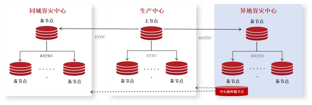 系统正常运行时使用生产中心,而当生产中心出现全局故障后,同城灾备中心自动切换为主节点对外提供服务,主节点下挂节点自动切换为同步模式。当同城灾备中心作为灾备中心使用时,数据库属于只读模式,同城灾备中心与生产中心同步节点可参与实时性高的读请求对外提供服务,下挂的两个备节点可承担非实时性查询类业务(报表类、数据导入导出等日常业务)数据需要。