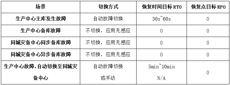 同城双中心 | 中心级故障 | 分钟级 | ≥0 |