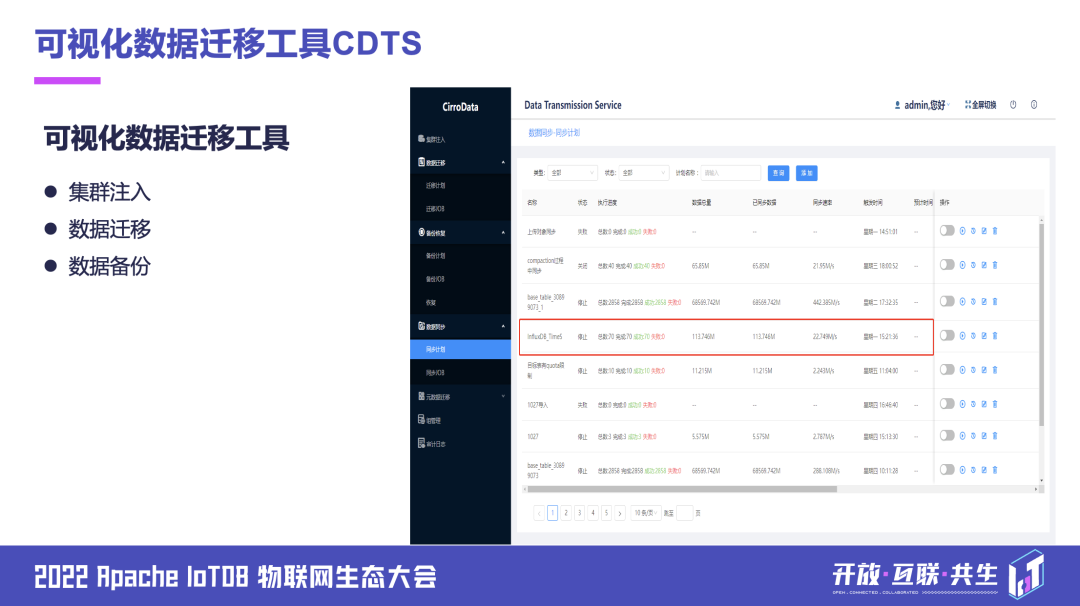 下面是我们的一个可视化的数据迁移工具CDTS,它可以跟可视化集群管理平台联动,从管理平台导入集群的一些信息。数据迁移主要是一些旧的数据文件和系统数据导入到时序库里面,做一些数据备份的功能。数据迁移支持并发的访问,并发的迁移能达到比较好的一个速度。