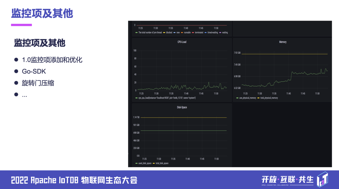 这个是我们做的关于监控项相关的工作,1.0 版本它有一些监控项,我们做了一些监控项的添加,还有一些优化。在之前其实我们还参与过Apache IoTDB Go-SDK 的一些开发,还有旋转门开发等等其他的一些开发。下面我来给大家简单的分享一下我们使用Apache IoTDB的一些案例。