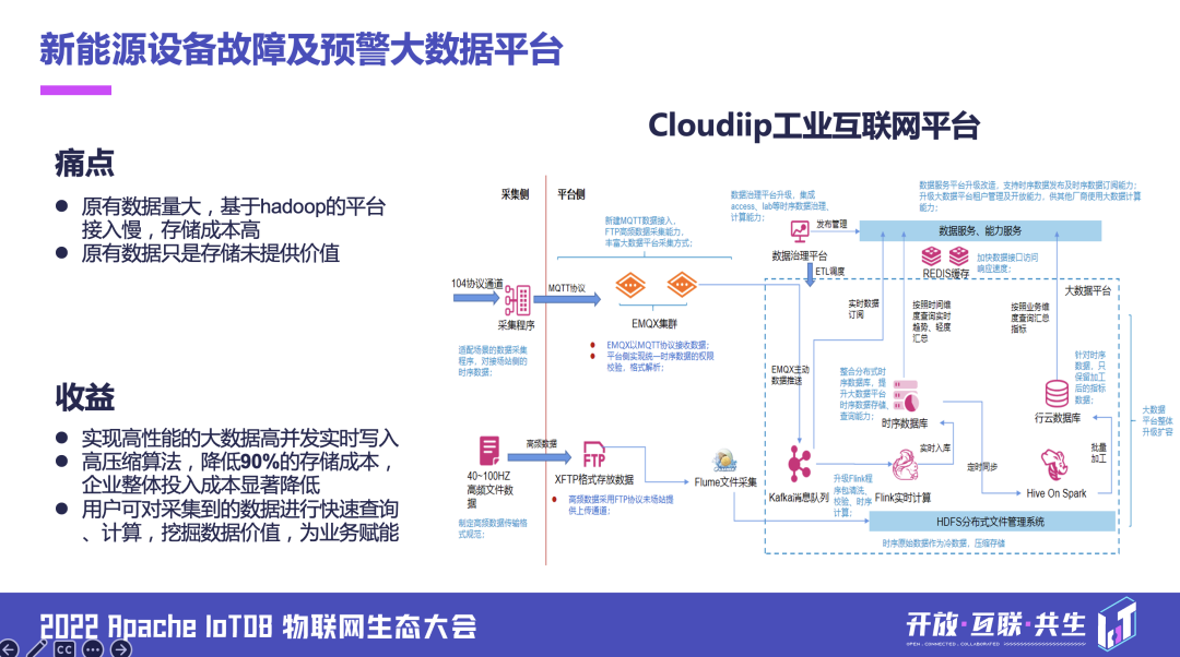 第一个案例是一个新能源设备故障及预警大数据平台,它原来的痛点是数据量比较大,之前是基于 Hadoop 的平台,接入比较慢,存储成本比较高,原有的数据只有存储,没有提供价值。后面采用我们 Cloudiip工业互联网平台之后,它实现了大数据高并发的实时接入,因为主要还是时序类的数据,这个数据存入到时序库里面,能降低 90% 的存储成本,企业整体投资成本显著降低。而用户可以对采集到的数据进行快速的查询、计算、挖掘数据价值,为业务赋能。