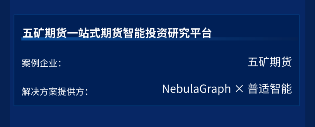 NebulaGraph 成功入选 2022 爱分析·最佳实践案例在最近举办的“2022爱分析·中国数据智能最佳实践案例”评选活动中, NebulaGraph 与普适智能联合打造的五矿期货一站式期货智能投资研究平台作为最佳实践案例成功入选。该平台基于 NebulaGraph 性能高效的图技术底座能力,成功实现了深层次、复杂关联关系挖掘和可视化图谱分析,目前已在五矿期货产业链交易链路、投资事件分析、合规风控、客户画像分群、客户消费图谱等多个应用场景中落地。