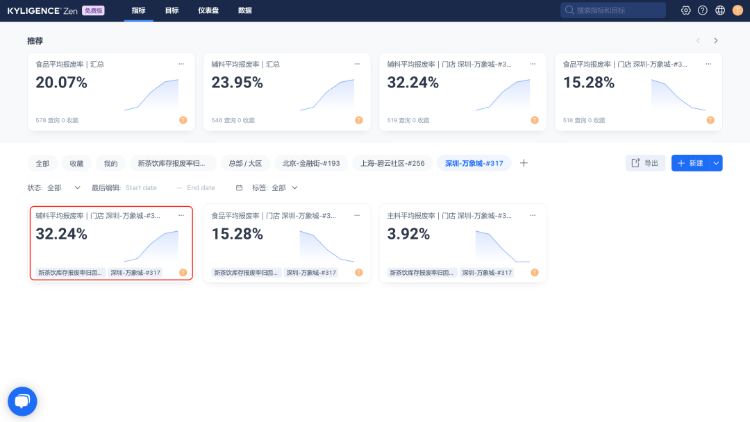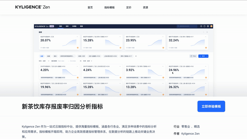 对于 小 L 来说,首先想到的库存报废率相关的指标,这本身这是一个相对耗时的从 0 到 1 的指标体系建设过程,但在 Kyligence Zen 里可以一键完成。小 L 来到 Kyligence Zen 的主站点,进入指标模板,搜索关键词“新茶饮库存”。