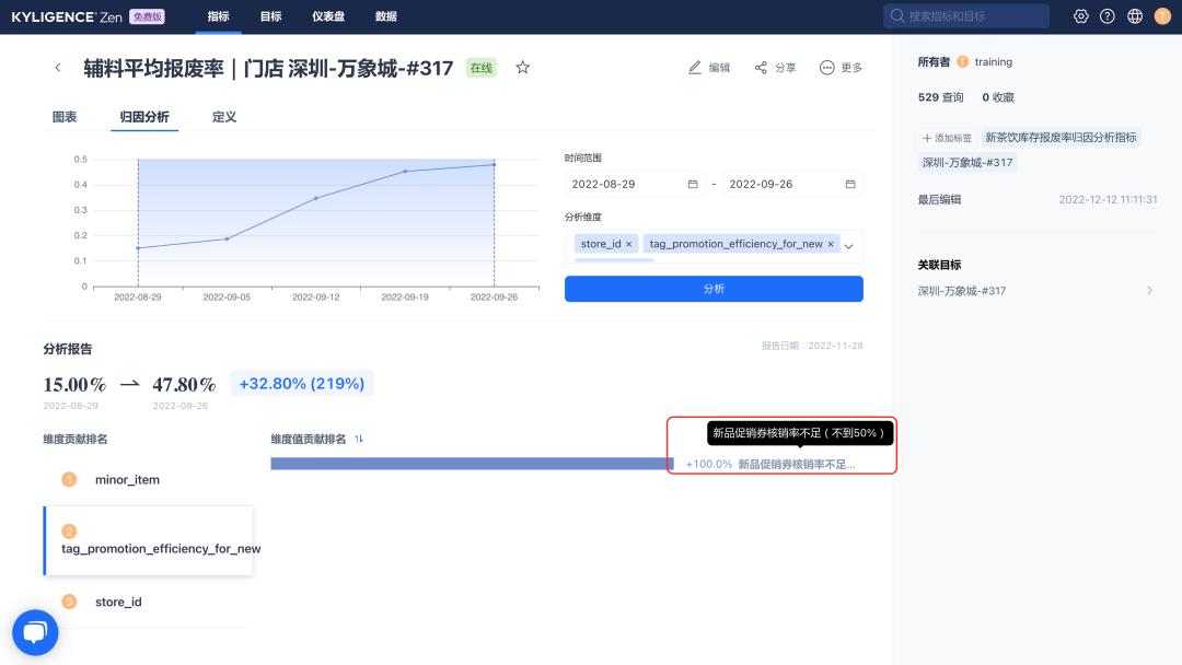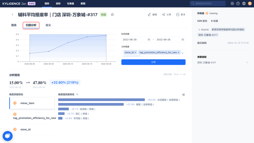 紧接着就是关键的「归因分析」,找到导致辅料报废率走高的主要因素。过去做归因分析,不仅要提前建模,还要经过时间周期和分析维度确认,各不同维度下按指标口径取数和聚合以及对比这一长串过程,整个数据处理链路不仅需要专门的数据分析或 IT 团队,而且一套流程走完就要一到两周,时效也没法保证。而现在小 L 进入自己门店的“辅料平均报废率”指标,直接点击“分析”,即刻就能看到一份图文并茂的报告,还可以自己调整时间范围,或是增加更多和当前指标关联的维度。