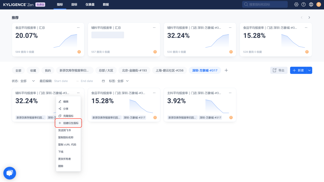 对于小 L 来说,Kyligence Zen 这套平台的价值还不止于此,她很快发现:经常关注的同 环比这类指标,现在也可以自主定义,对于寻求改善的“辅料平均报废率”指标,她可以自助通过简单的点选就能完成一个衍生指标的定义,进行过程监控。