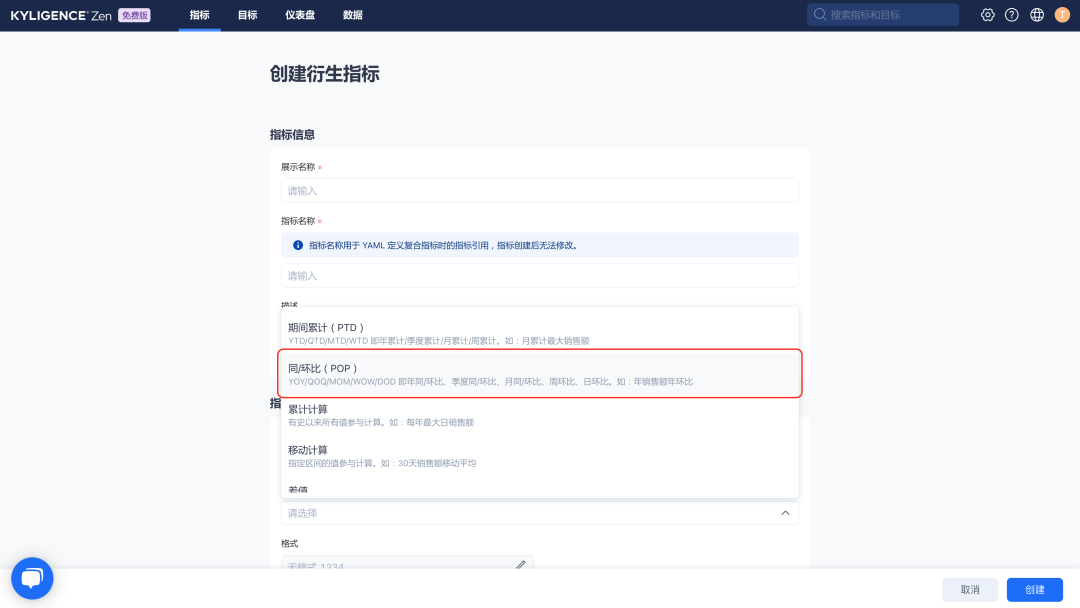 业务人员可以根据需要直接创建同 / 环比等衍生指标