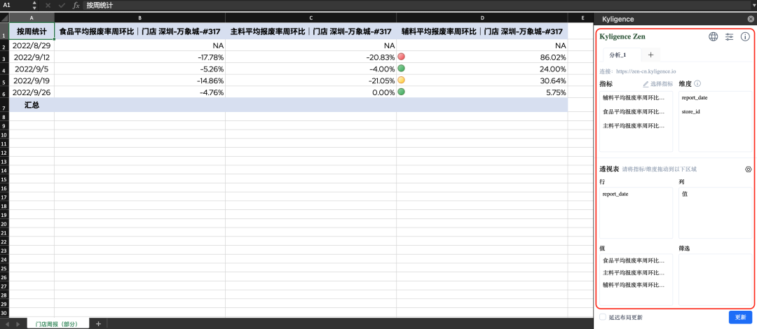 更惊喜的一点在于,这些定义好的同 / 环比指标可以直接嵌入到她每周都要花上不少精力去完成的 Excel 报表里,而且整个的操作过程就是沿用她所熟悉的“透视表”方式,Kyligence Zen 真正让她从数据汇报这件事里释放出来,从更广阔的层面提升人效。