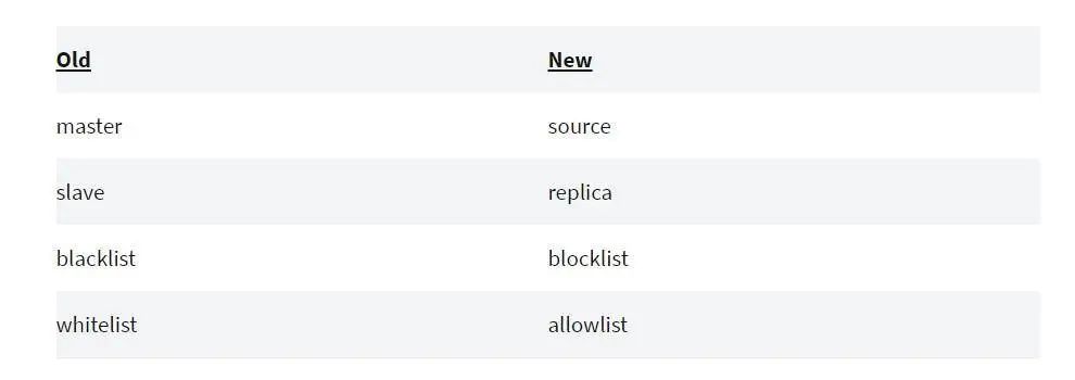 另外,技术术语的替换也是需要一定的时间。以 MySQL 团队的实践为例,虽然 MySQL 部分语法的调整可以通过为现有命令添加别名的方式实现,例如将 SHOW SLAVE STATUS 变更为 SHOW REPLICA STATUS。但这还远远不够,仍有很多命令会在返回的结果列名称中包含文本“主”与“从”表达。